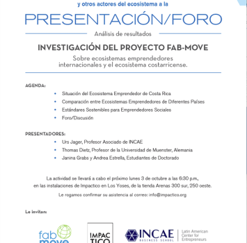 On 3rd October, FAB-MOVE and INCAE Business School (Costa Rica) have presented and discussed their results of research on entrepreneurial ecosystems and sustainable standards for social entrepreneurs in a comparative perspective. Thomas Dietz, WP 3 leader of FAB-MOVE from Muenster University, whose secondment to INCAE comes to an end in the middle of October and Urs Jaeger from INCAE have, along with the PhD students Janina Grabs and Andrea Estrella, provided a forum for discussions on the results of their analysis.